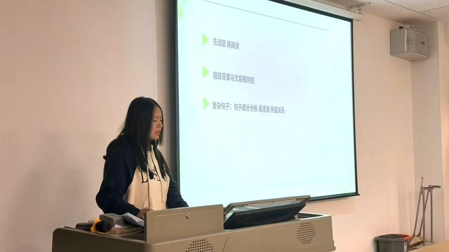 作为优秀学生代表,郝欣雨同学结合自身高效的备考实践,为同学们带来了在听力部分的宝贵经验。她强调“预读”是关键,在播放指令和题目间隙快速浏览选项,预测对话或短文主题,并圈定关键词。针对正确率低于50%的材料,建议先看材料听录音,合上材料听问题再做一遍题,也可逐句精听,采用口头复述的方式练习。她建议练习听力需要日复一日积累,踏踏实实磨耳朵才会见效。在阅读理解部分,陈汁同学详细解析了选词填空、长篇阅读和仔细阅读三大题型的解题技巧。对于分值高、难度大的仔细阅读,她重点传授了“定位—比对—排除”的解题流程,结合实例指导学生如何准确找到题目在文中的出处,并进行精准的信息比对,从而有效排除干扰项。