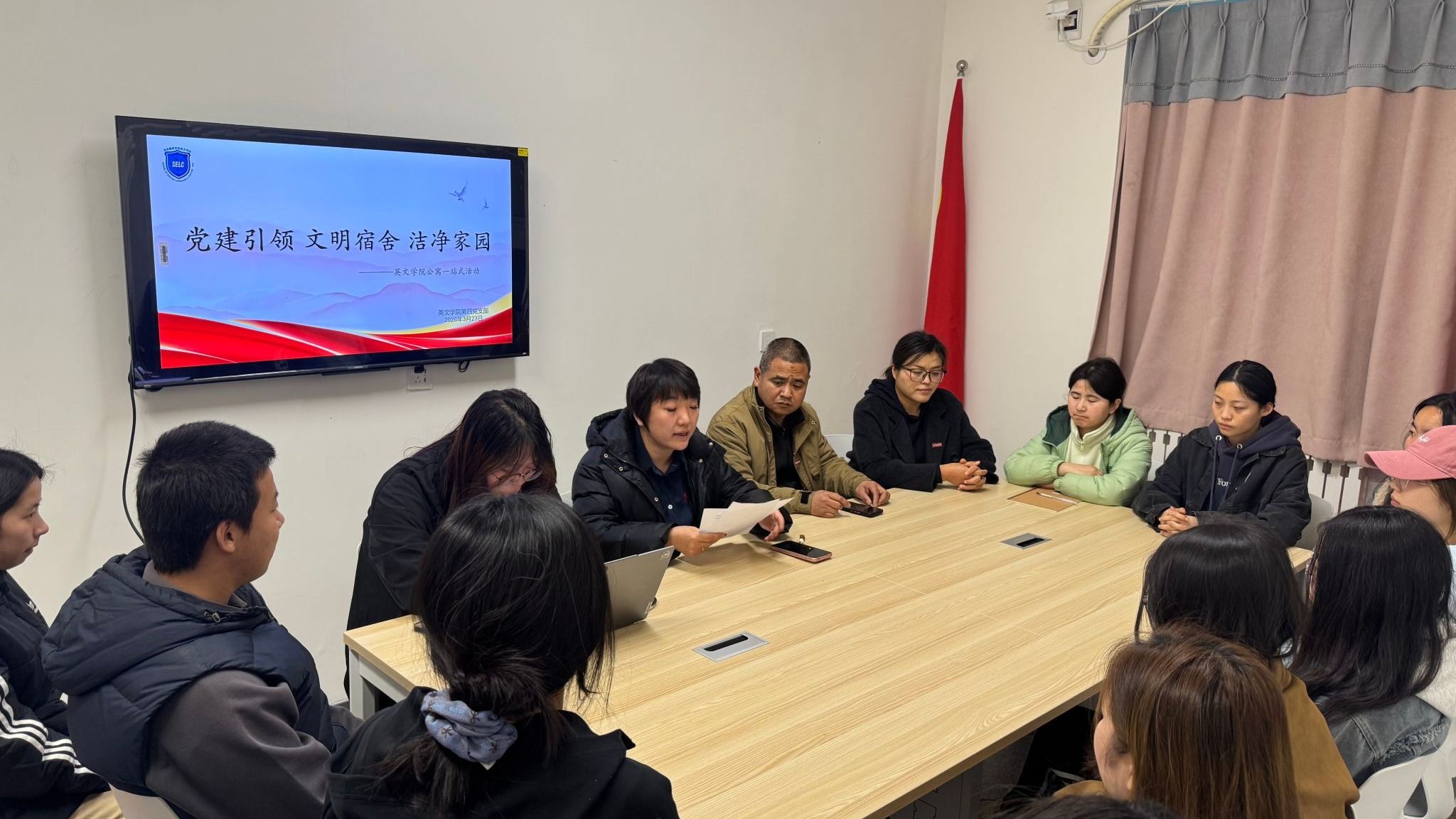 为深入学习贯彻党的二十大精神,充分发挥学生党员先锋模范作用,进一步推动党建工作进公寓、进宿舍,营造安全、整洁、文明、和谐的住宿环境,3月23日,英文学院第四党支部于西十二学生公寓开展“党建引领·文明宿舍·洁净家园”主题党日活动。