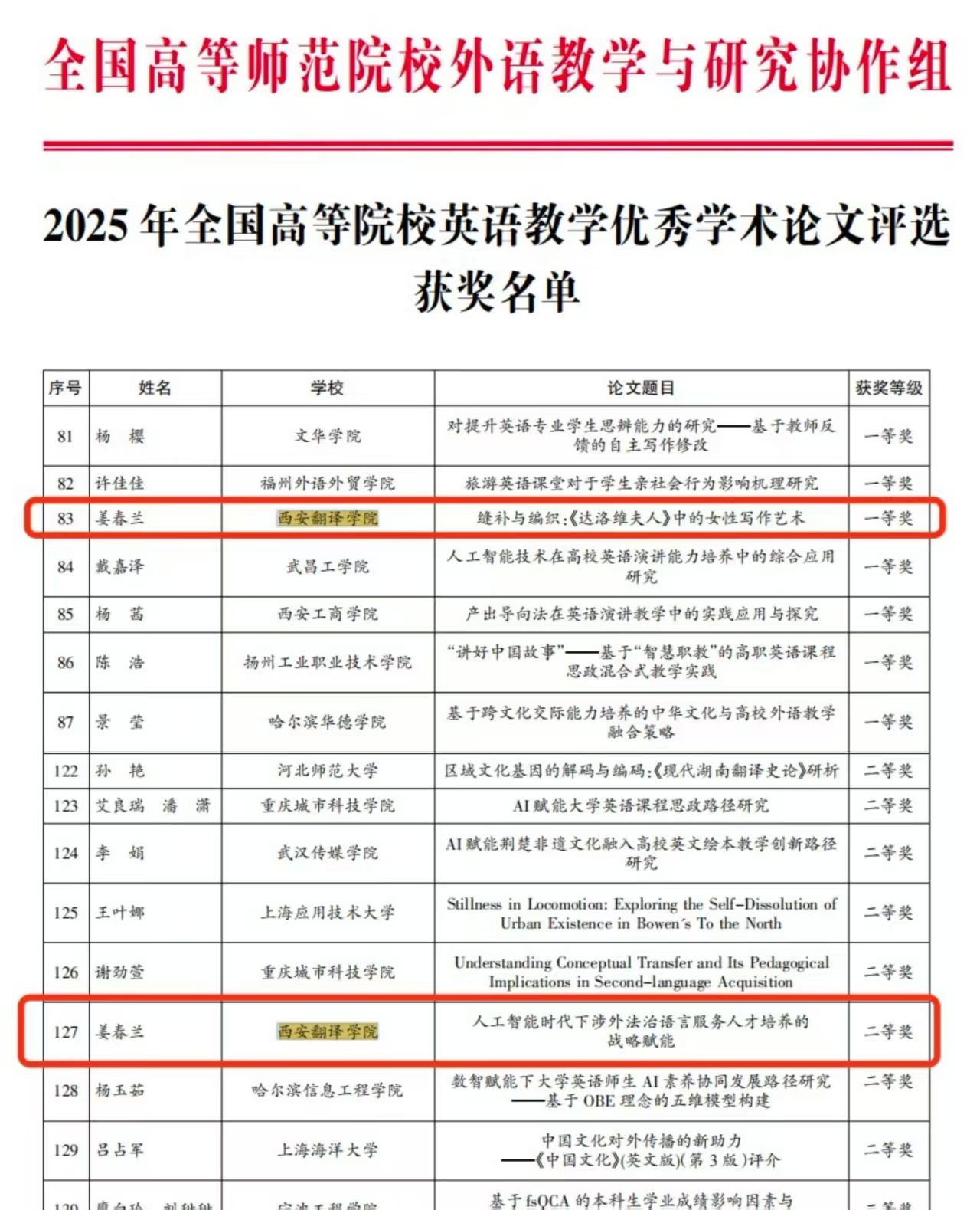 10月26日,在刚刚落幕的“2025年第十届全国高等院校英语教师教学基本功大赛”上,我院英语系及翻译系共七名教师,在四个赛道众多优秀参评作品中荣获八项大奖,创造了我院在此赛事中的最佳成绩。赛前,学院领导高度重视参赛工作,提前部署备赛方案,组织多轮培训与集中研讨,教师竞赛团队通力协作、精心打磨参赛作品,为本次优异成绩奠定了坚实基础。在微课组优秀课例评比中,莫丽娅、晁玉朦教师团队、申雅洁老师均荣获全国三等奖;在实录课英语专业组中,殷锦珂老师、张琬晨老师分别荣获省级一等奖、省级二等奖;在说课组比赛中,张益迎老师、姜春兰老师分别荣获省级一等奖、省级二等奖;在优秀学术论文评选中,姜春兰老师的两篇学术论文分别荣获一等奖、二等奖。