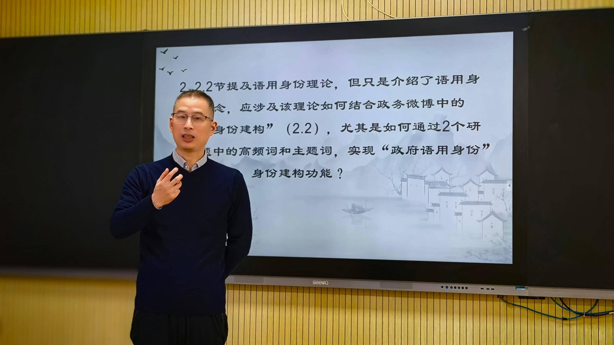 袁教授从自身论文退稿与修改经历出发,结合国内期刊栏目设置与发表趋势,深入剖析了期刊选题偏好与论文撰写中的常见误区。他以《政务微博中的政府语用身份建构研究》为例,指出文献综述与研究问题脱节、理论应用不深入、研究方法不清晰等典型问题,强调论文写作必须注重逻辑一致性与论证可信度。在案例讲解中,袁教授进一步分析了“高频词”“主题词”与“语用身份建构”之间的关联困境,指出单纯依赖词频统计难以体现语用身份的动态性与语境化特征。他提醒在场教师,在论文设计阶段应明确理论工具与研究问题的契合度,避免“数据驱动”与“理论脱节”的双重陷阱。