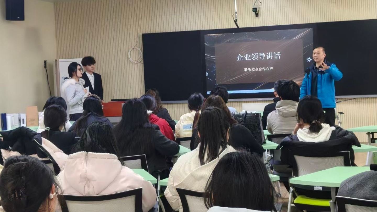 英文学院院长助理简实在讲话中强调,英文学院院长袁小陆教授高度重视并大力支持此次深度产教合作,认为是学院深化应用型人才培养改革、主动对接区域经济发展需求的关键一步。她指出,将真实的企业项目引入教学实践环节,能够有效破解理论教学与产业实践脱节的难题,对于培养学生的职业素养和解决复杂商务问题的能力具有重要意义。