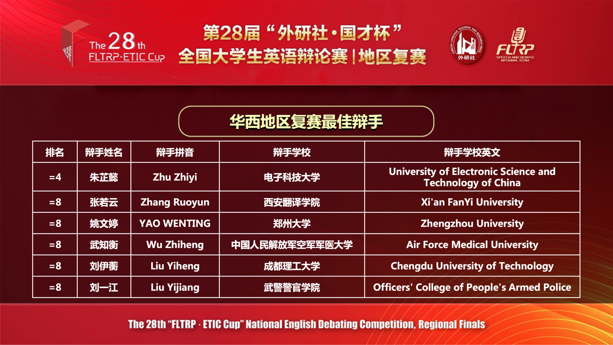 第二十八届“外研社·国才杯”全国大学生英语辩论赛华西地区复赛于4月18日至19日举行。在孔彬老师与晁玉朦老师的细心指导下,我校英文学院学生朱悦杨、张若云组成的代表队奋勇拼搏,从华西地区百余支参赛队伍中脱颖而出,以第24名的优异成绩成功突围,获得华西地区复赛金奖,顺利晋级将于五月份举行的全国总决赛,张若云同学荣获“最佳辩手”称号。