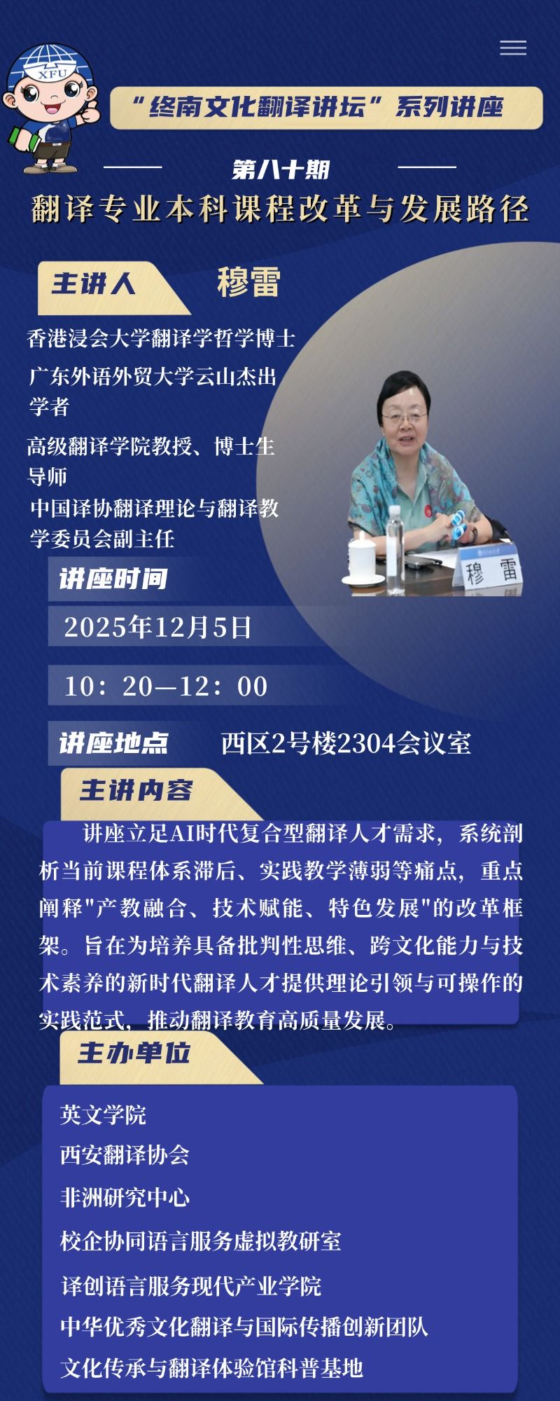 讲座主题:“终南文化翻译讲坛”系列讲座第八十期——翻译专业本科课程改革与发展路径
