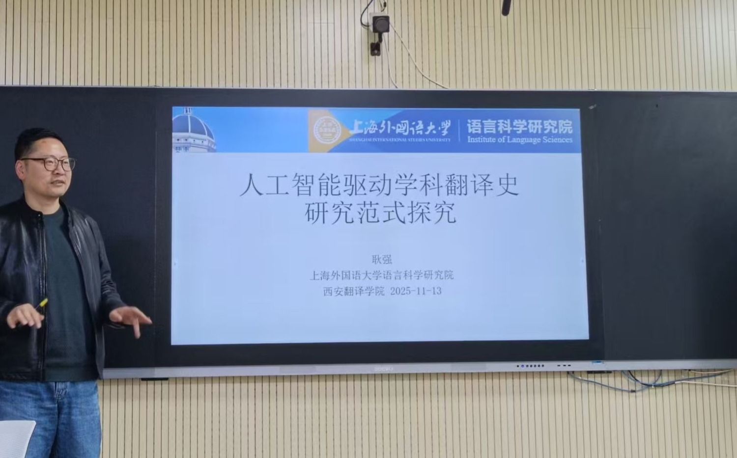 2025年11月13日下午,“终南文化翻译讲坛”第七十七期学术讲座在西区2号楼2401教室成功举行。本期讲座特邀上海外国语大学语言科学研究院专职研究员、博士生导师耿强教授担任主讲,以《人工智能驱动翻译史研究的理论与方法》为题作专题报告。英文学院院长袁小陆教授、副院长张睿教授、李燕教授出席讲座,讲座由张睿副院长主持。